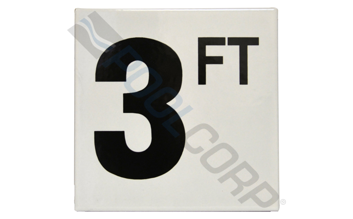 Inlays; C610030 FT Series Smooth Frost-Proof Waterline Depth Marker; 3FT; 6 x 6″ Tile; 1/4″ Thick; Ceramic White Tile with Black Legend; 4″ Letter
